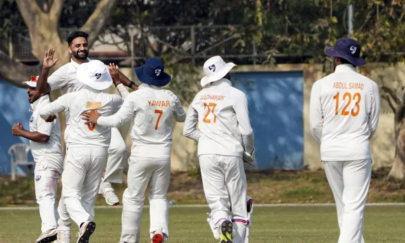 പശ്ചിമ ബംഗാളിന്റെ വിക്കറ്റ് വീഴ്ത്തിയ ജമ്മു-കശ്മീരിന്റെ ആഖ്വിബ് നബി സഹതാരങ്ങൾക്കൊപ്പം ആഹ്ലാദത്തിൽ